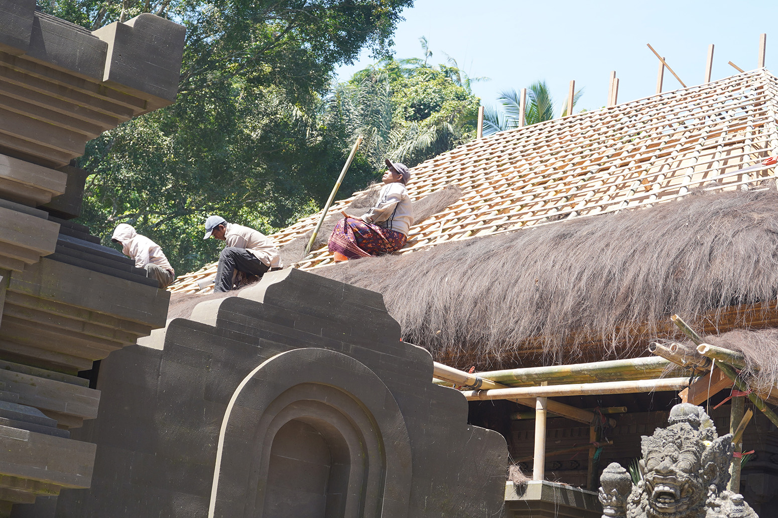 ティルタエンブル寺院を訪ねた時、丁度、境内の新築建物の屋根上で何人もの職人が棕櫚を葺いていたので、作業の様子をよく見ると日本の合掌作りの茅葺きのように「下地の枠組みに茅葺屋根を直接載せる」のではなく「板で葺いた後に、下地を載せ、その上に棕櫚を葺く」手順でした。