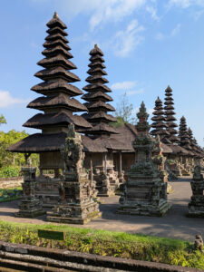 世界遺産タマン・アユンの見学時、境内に林立する「棕櫚葺き屋根塔群」の美しさに感銘を受けましたが、バリでは道路沿い100mおき位にある小さなヒンズー教寺院境内に「棕櫚葺き屋根の塔」が建っているところがあります。